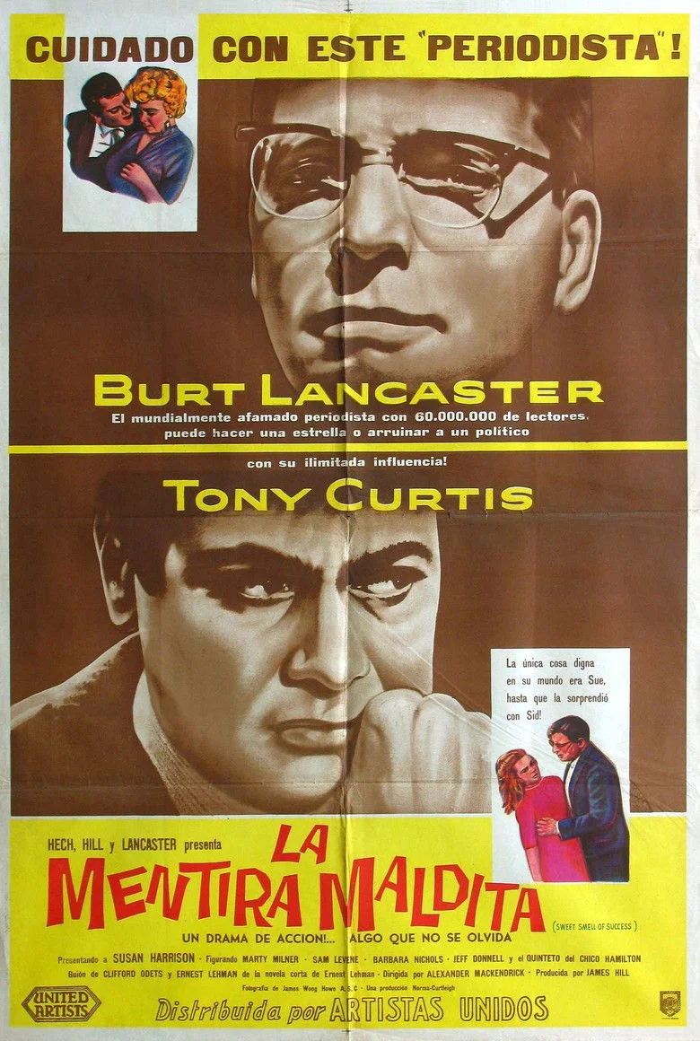 Sinopsis: Burt Lancaster y Tony Curtis se adentran en el misterioso mundo de la fauna nocturna que puebla el centro de Manhattan, en un juego siniestro de poder y en un universo de supervivencia. Con uno de los diálogos más corrosivos del cine de todos los tiempos esta película es uno de los títulos más grandes que Hollywood ha creado. Burt Lancaster, encarna a un poderoso, famoso y ambicioso columnista que domina toda una ciudad a través de la información que habitualmente consumen sus más de 60 millones de lectores. Pero como todo el mundo tiene un punto débil: su hermana pequeña. Todo cambiará cuando ésta se enamora apasionadamente de un guitarrista de jazz y los instintos más básicos del periodista salgan a relucir.