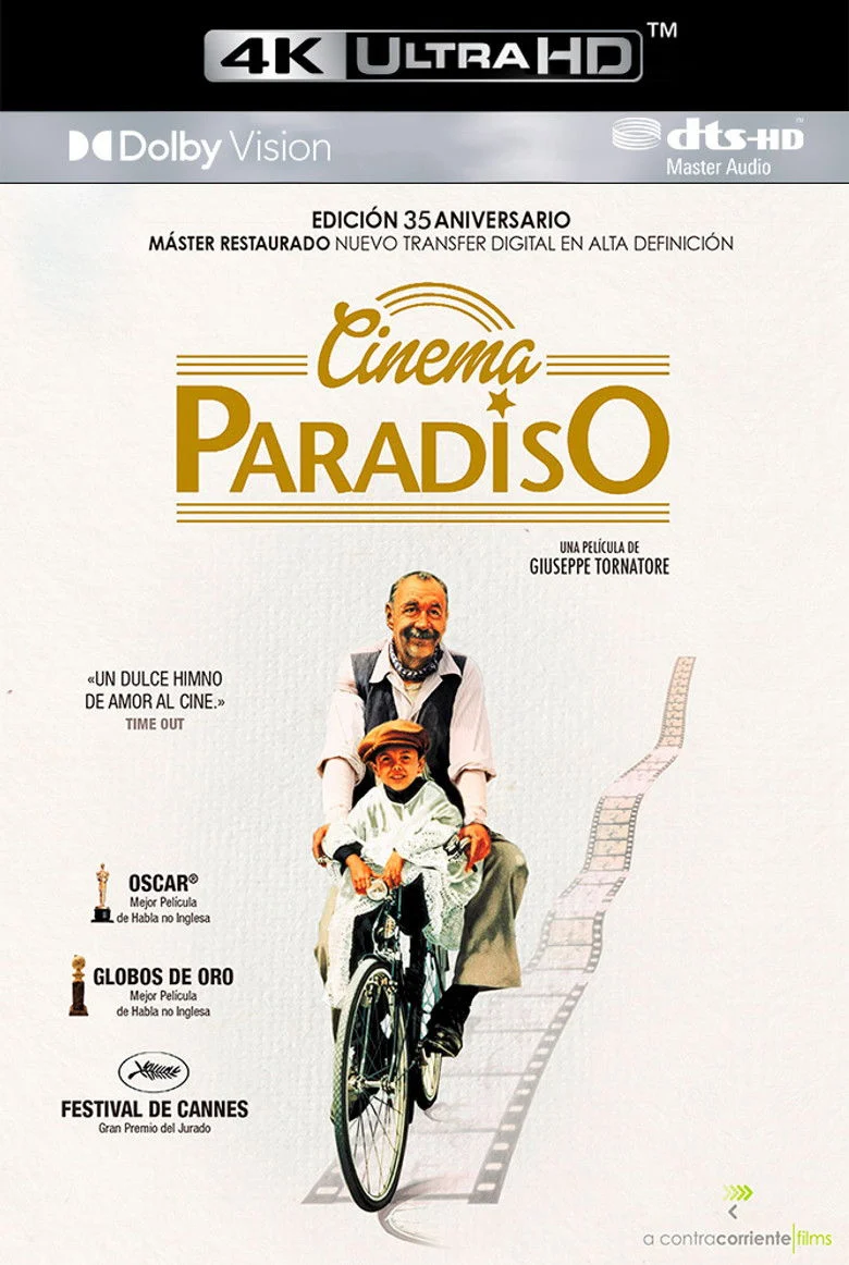 Sinopsis: En los años previos a la llegada de la televisión (justo después del final de la Segunda Guerra Mundial), en un pequeño pueblo siciliano, el joven Toto (Salvatore Cascio) vivía fascinado por el cine. Toto trata de entablar amistad con Alfredo (Philippe Noiret), el proyeccionista del cine local, una persona muy irritable pero con un gran corazón. Todos estos hechos se presentan en forma de nostálgicos recuerdos de Toto (Jacques Perrin) que ha crecido hasta convertirse en un cineasta de éxito, y que revive a su infancia cuando recibe la noticia de que Alfredo ha muerto.