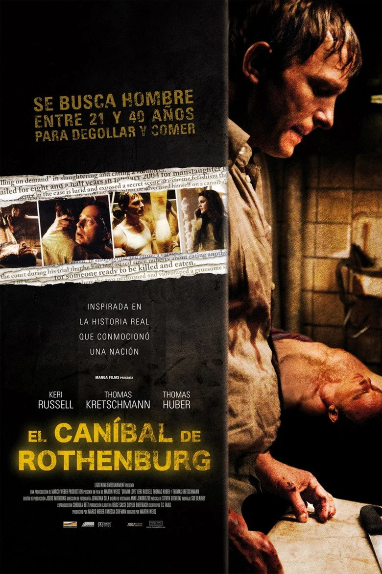 Sinopsis: Hace poco más de cinco años, un apacible informático mutiló, asesino y devoró a un hombre tras supuestamente alcanzar un acuerdo mutuo a través de internet. El caso del llamado “caníbal de Rohtenburg”, uno de los que más polémica han generado en la última década, ha servido ahora de inspiración para la primera película del director de videoclips Martin Weisz. Un truculento thriller protagonizado con solidez por Thomas Ketschmann en el papel de asesino caníbal y Thomas Hubber en el papel de víctima, cuya abrupta narrativa se entrecruza con la investigación que del suceso se haya efectuando una joven psicóloga americana (Keri Russell). Prohibida en Alemania pocos días antes de su estreno. (FILMAFFINITY)