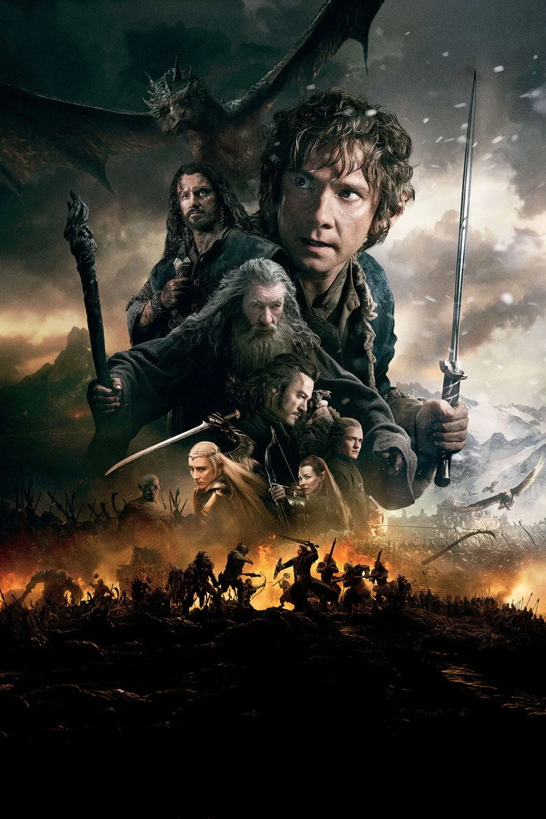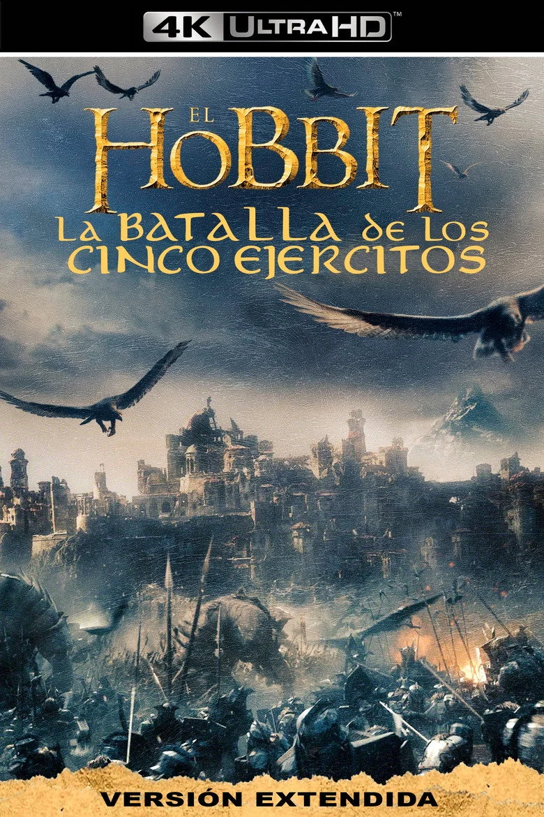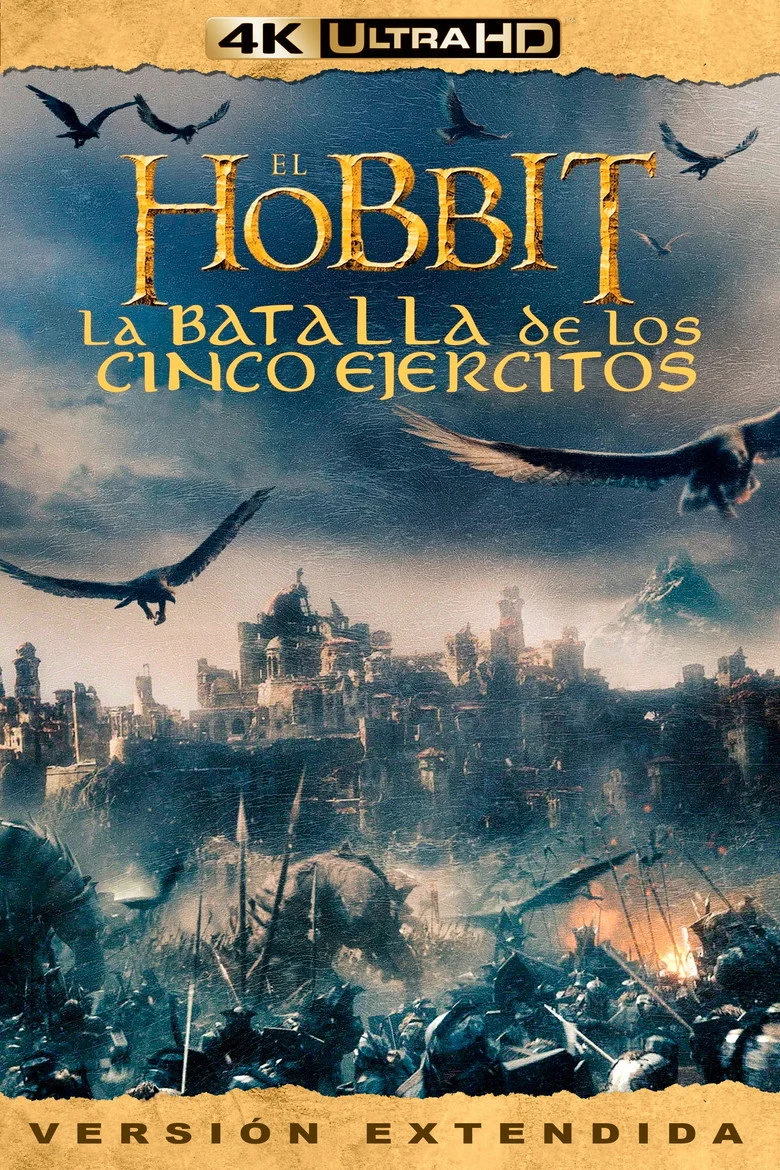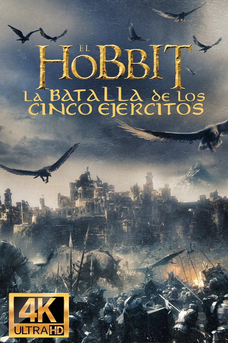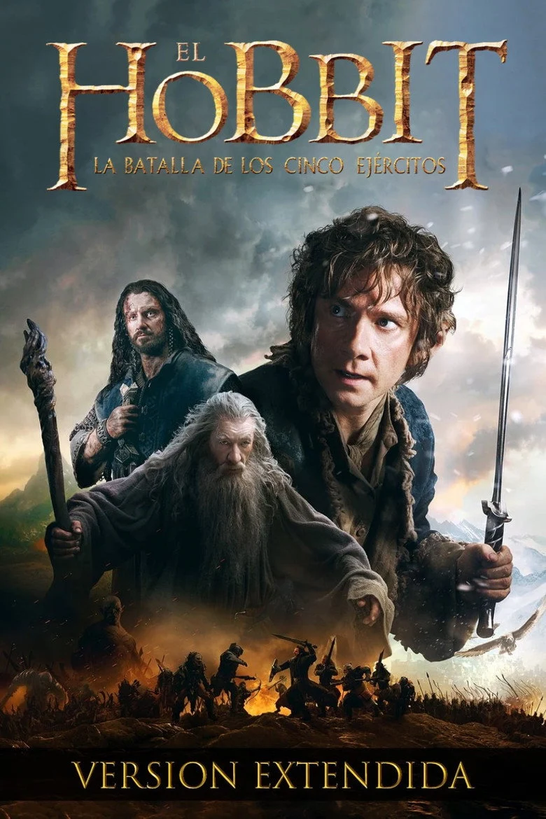 Sinopsis: Después de haber recuperado el reino del Dragón Smaug, la Compañía ha desencadenado, sin querer, una potencia maligna. Un Smaug enfurecido vuela hacia la Ciudad del Lago para acabar con cualquier resto de vida. Obsesionado sobre todo con el reino recuperado, Thorin sacrifica la amistad y el honor para mantenerlo mientras que Bilbo intenta frenéticamente hacerle ver la razón por la que el hobbit toma una decisión desesperada y peligrosa. Pero hay aún mayores peligros por delante. Sin la ayuda aparente del mago Gandalf, su gran enemigo Sauron ha enviado legiones de orcos hacia la Montaña Solitaria en un ataque furtivo. Cuando la oscuridad se cierna sobre ellos, las razas de los Enanos, Elfos y Hombres deben decidir si unirse o ser destruidos. Bilbo se encontrará así en la batalla épica de los Cinco Ejércitos, donde el futuro de la Tierra Media está en juego.