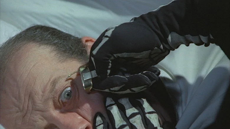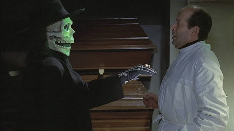 Sinopsis: Sir Oliver Ramsey fallece en un accidente aéreo. Su cuerpo resulta destrozado, pero no se encuentra su anillo en forma de escorpión. Durante su funeral, una carcajada que parece proceder del féretro resuena por toda la iglesia. Peggy Ward, una periodista presente, empieza a informar sobre el “cadáver que ríe”. Poco después se encuentra el cuerpo de Merryl, el abogado de Ramsey, quien ha sido asesinado inyectándole veneno de escorpión. Según algunos testigos, el autor es una siniestra figura vestida de negro y cuyo rostro está cubierto por una calavera. Sir Cecil, el hermano de Sir Oliver, cree que éste ha regresado de la tumba en forma de “zombie”, con el propósito de matarle. El inspector Higgins y la joven periodista, investigan el caso, abren la tumba de Sir Oliver. Al hacerlo reciben una desagradable sorpresa...