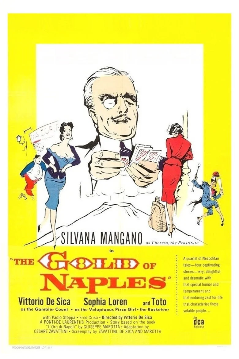 Sinopsis: Comedia que narra seis episodios ambientados en Nápoles: la historia de una cocinera (Sophia Loren) que extravía su anillo de casada, la de un jugador que pierde una partida con un niño, la de un payaso que es explotado por un gánster...
