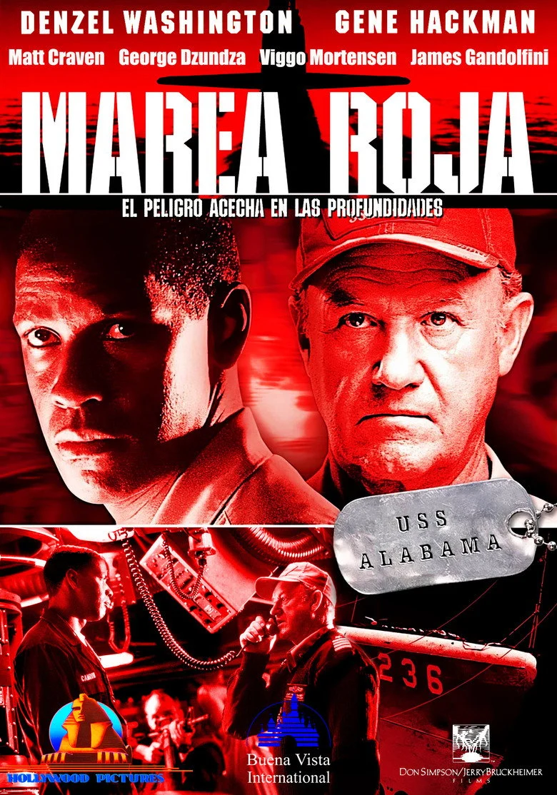 Sinopsis: Un grupo de nacionalistas rusos se ha apoderado de una base estratégica de misiles nucleares y amenaza al mundo. El 'Crimson Tide', el submarino nuclear más poderoso de los Estados Unidos, se dirige a las costas de Rusia. El Estado Mayor del submarino recibe la orden de bombardear a Rusia, justo cuando llega un segundo mensaje indescifrable. El Capitán Frank Ramsey y el Teniente Coronel Ron Hunter se pelean entre sí al dudar de la legalidad de las órdenes y luchan por el control de la nave.