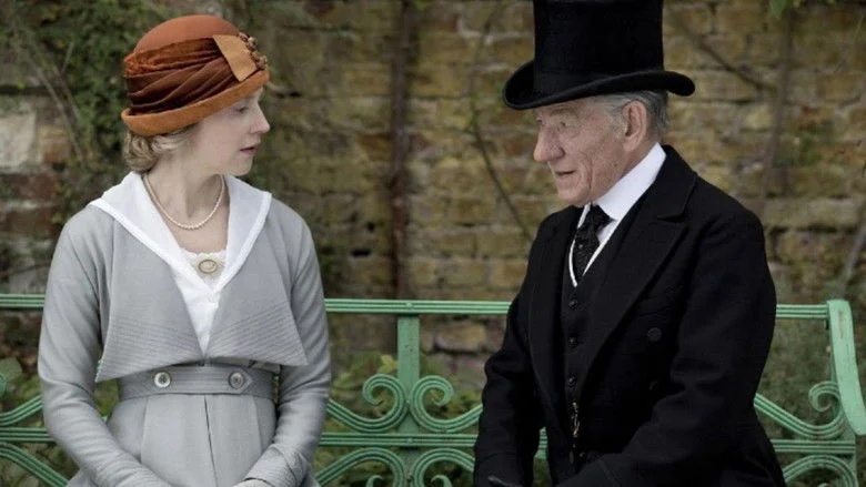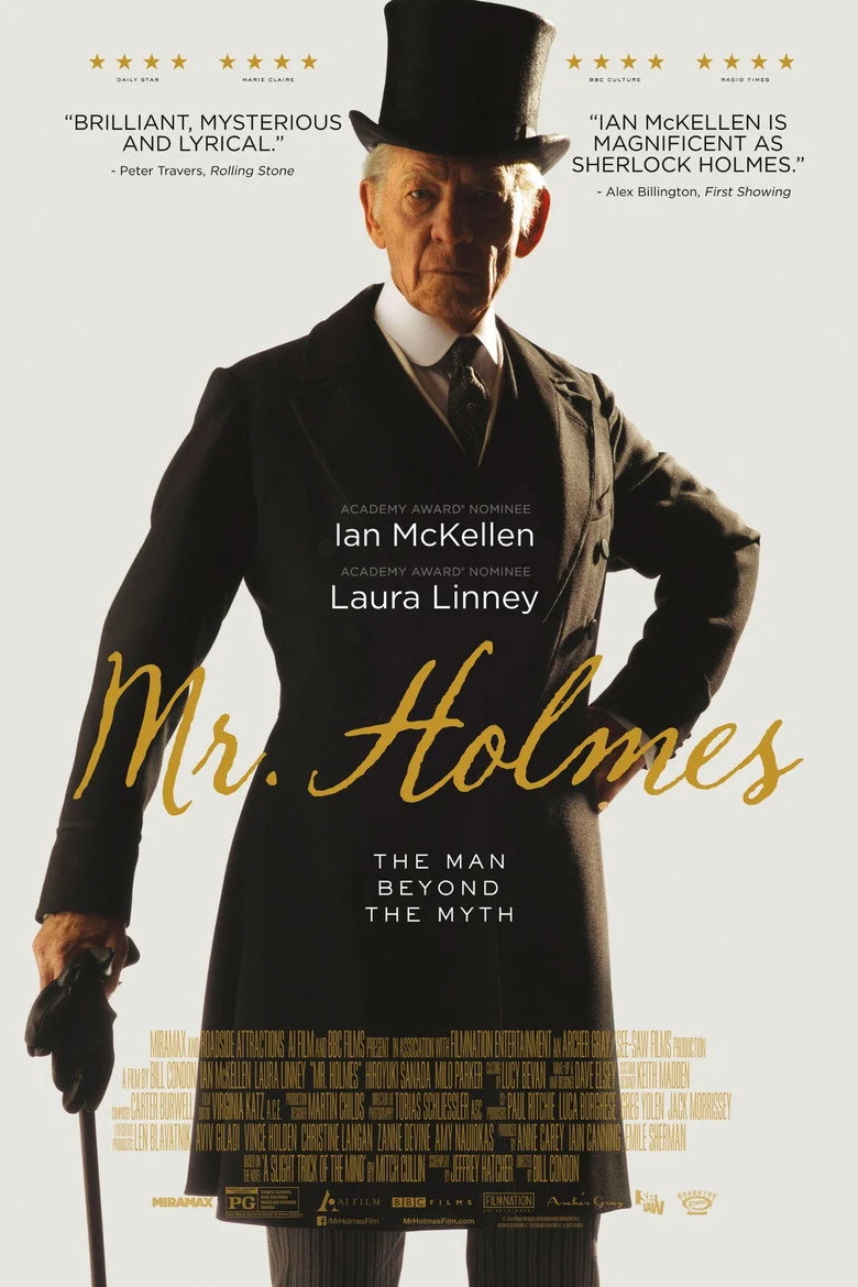 Sinopsis: En 1947, Holmes vive retirado en una remota granja de Sussex con un ama de llaves y el hijo de ésta. Cumplidos los 93 años, su memoria y su capacidad intelectual empiezan a deteriorarse. Su rutinaria vida se limita al cuidado de su colmena, a la escritura de su diario y a la lucha contra su pérdida de facultades. De repente, se le presenta un caso desconocido hasta el momento.