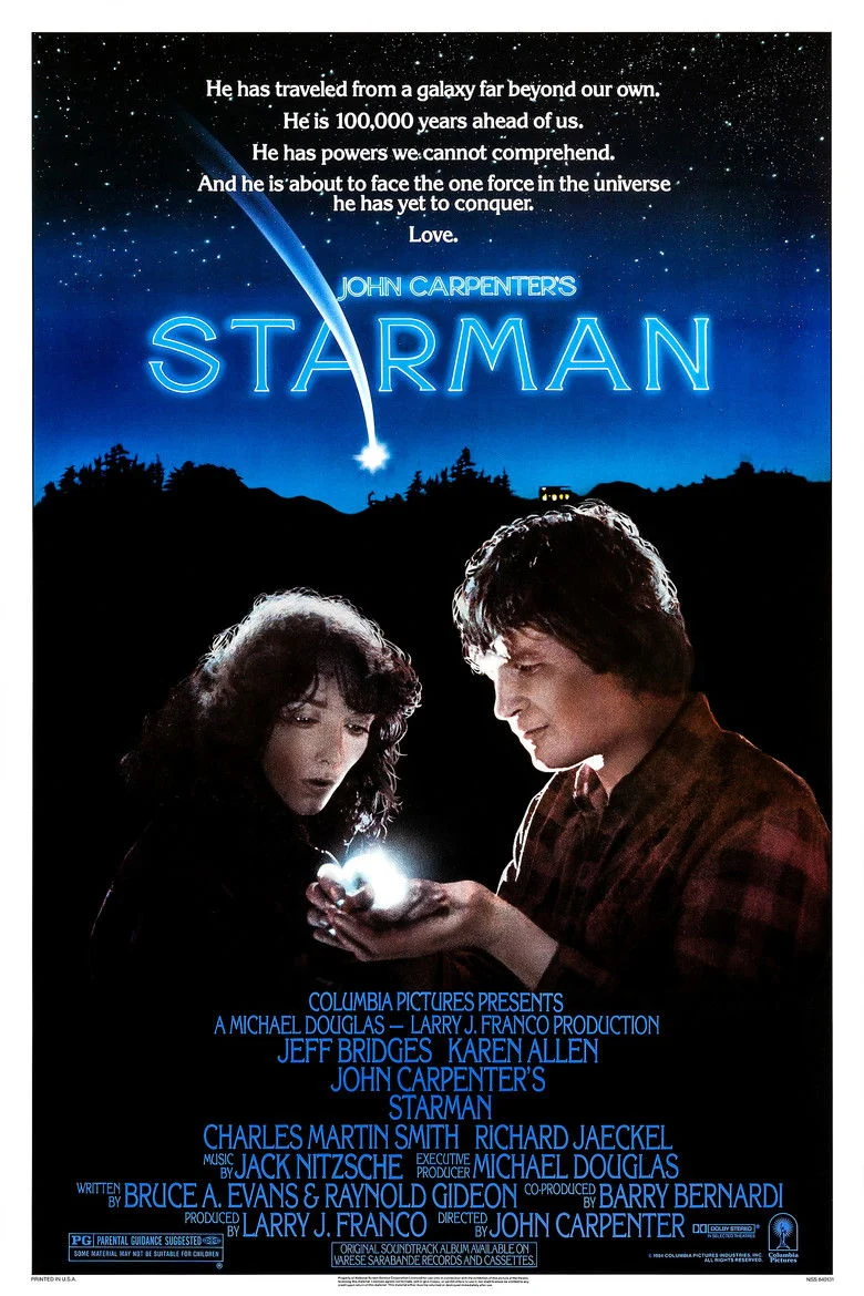 Sinopsis: Jeff Bridges da vida a un extraterrestre de un lejano planeta que aprende lo que significa estar enamorado. Cuando su nave es abatida en Wisconsin, Starman llega al recóndito refugio de una joven y desconsolada viuda, Jenny Hayden, y adopta la forma de su marido fallecido. El extraterrestre convence a Jenny para que le lleve hasta Arizona, diciéndole que si no es rescatado por la nave nodriza en el plazo de tres días, él morirá.