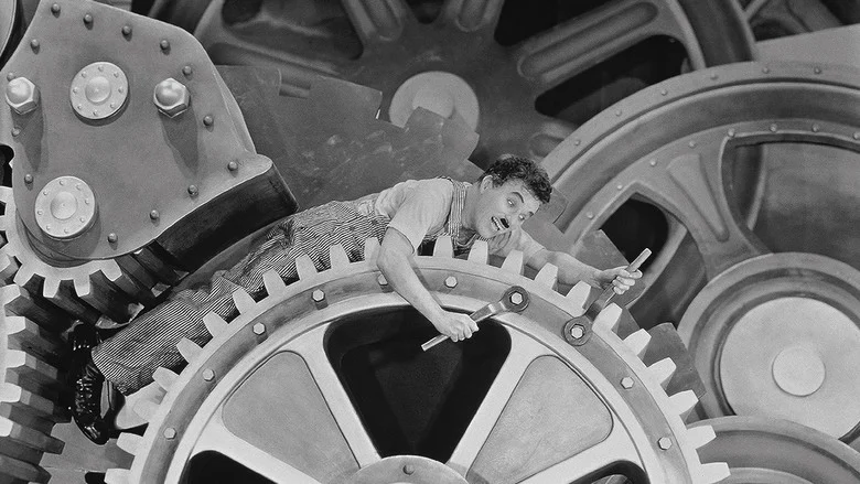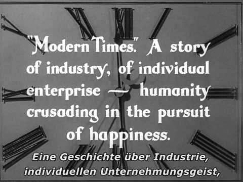 Sinopsis: Extenuado por el frenético ritmo de la cadena de montaje, un obrero metalúrgico acaba perdiendo la razón. Después de recuperarse en un hospital, sale y es encarcelado por participar en una manifestación en la que se encontraba por casualidad. En la cárcel, también sin pretenderlo, ayuda a controlar un motín, gracias a lo cual queda en libertad. Una vez fuera, reemprende la lucha por la supervivencia en compañía de una joven huérfana a la que conoce en la calle.