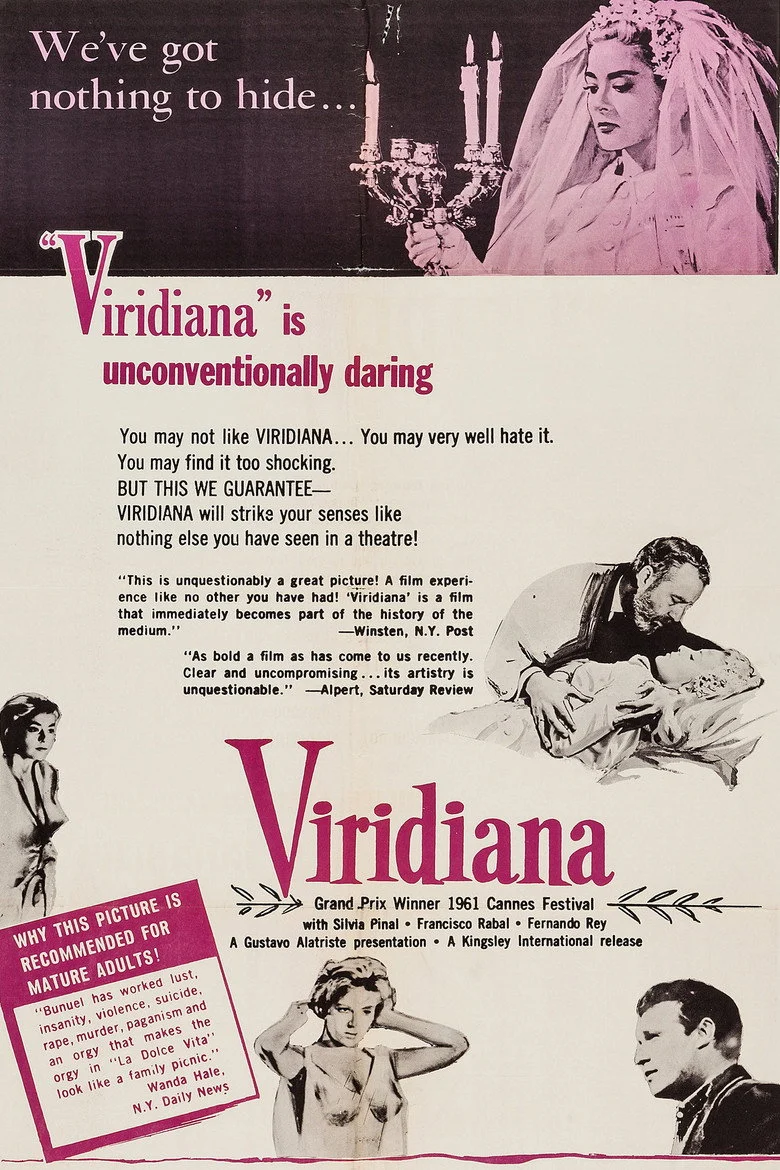 Sinopsis: Don Jaime, un viejo hidalgo español, vive retirado y solitario en su hacienda desde la muerte de su esposa, ocurrida el mismo día de la boda. Un día recibe la visita de su sobrina Viridiana, novicia en un convento, que tiene un gran parecido con su mujer.