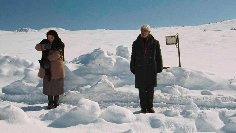 Sinopsis: Nos encontramos en las aldeas Kurdas del Cáucaso, en la devastada armenia post-soviética. Hamo es un viudo de 60 y tantos años, un oficial retirado de la armada roja. Sus únicos bienes son un viejo armario, un televisor ruso, su uniforme militar y una pensión de 7 dólares mensuales. Todos los días Hamo va hasta el cementerio y quita la nieve del retrato de la tumba de su esposa. Un poco más lejos, Nina, una atractiva viuda de 50 años, quita la nieve de la tumba de su marido. En el autobús que los trae de vuelta a sus aldeas viajan separados por tres filas de asientos. Hamo mira a Nina. Ella le devuelve la mirada. El paisaje fuera es totalmente blanco excepto por las piedras de las montañas. Cuando Hamo regresa a su pueblo encuentra una carta de su hijo que vive en París. El pueblo se altera.